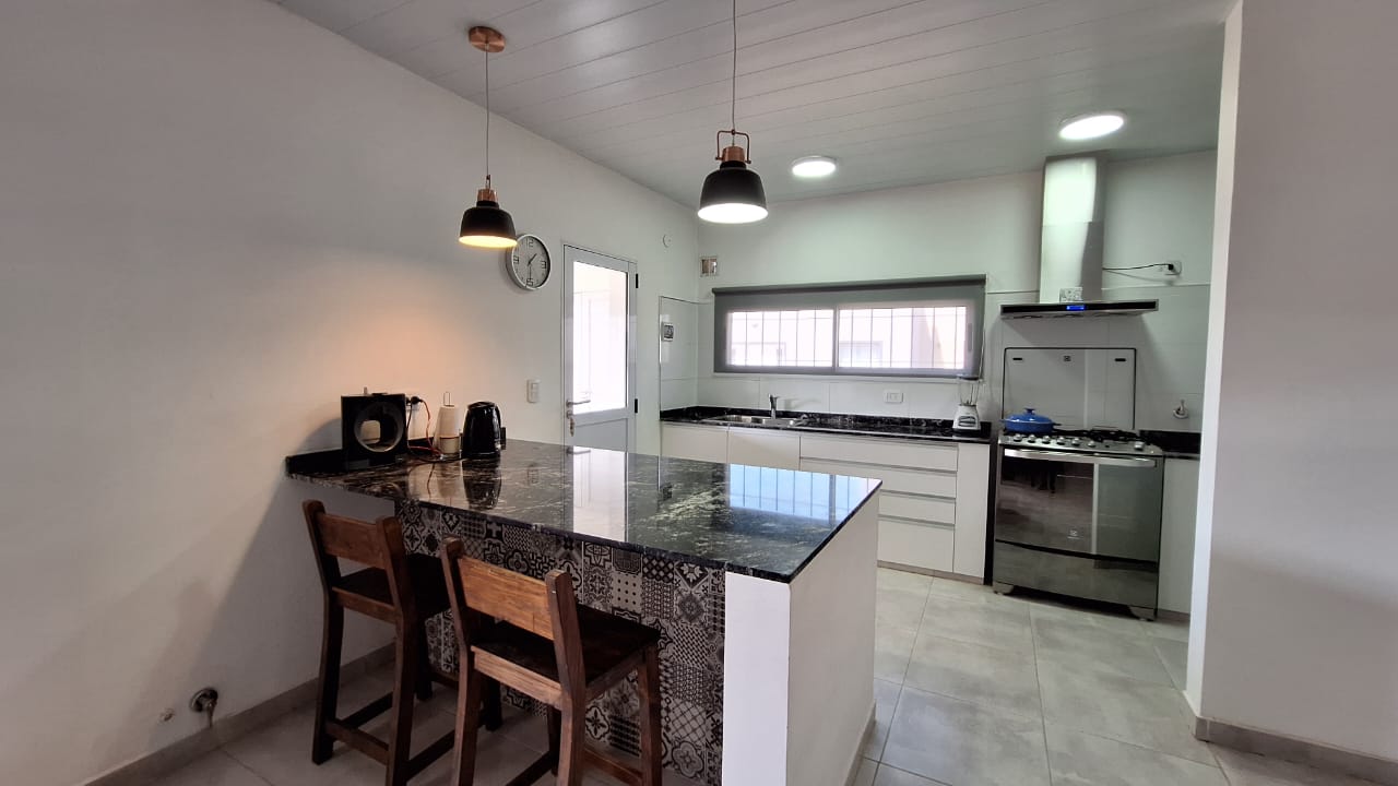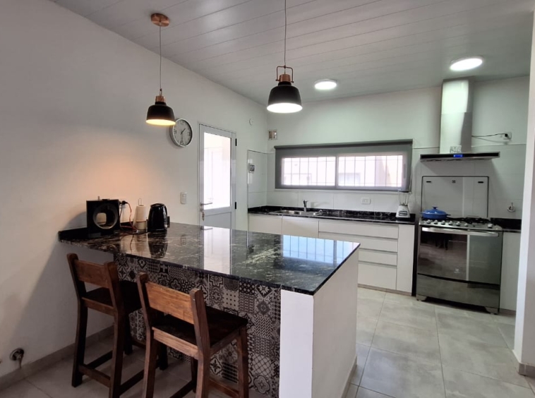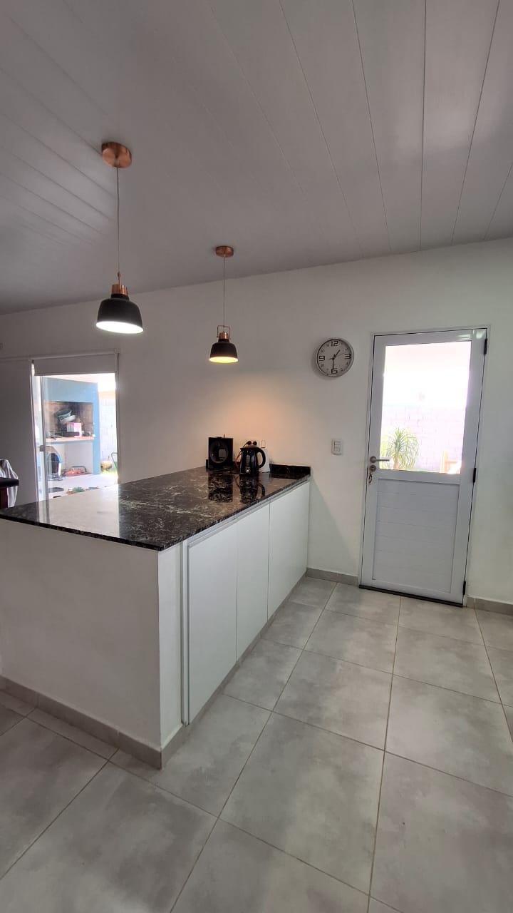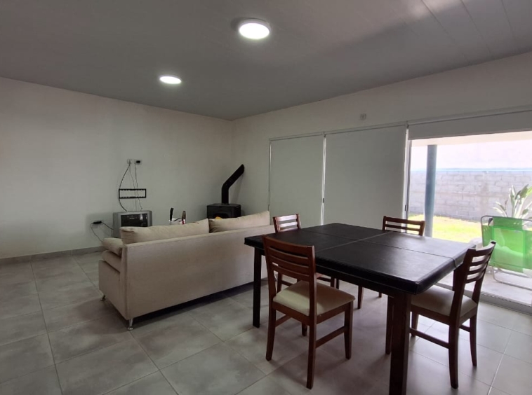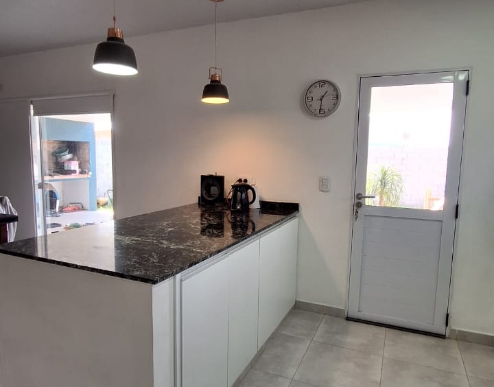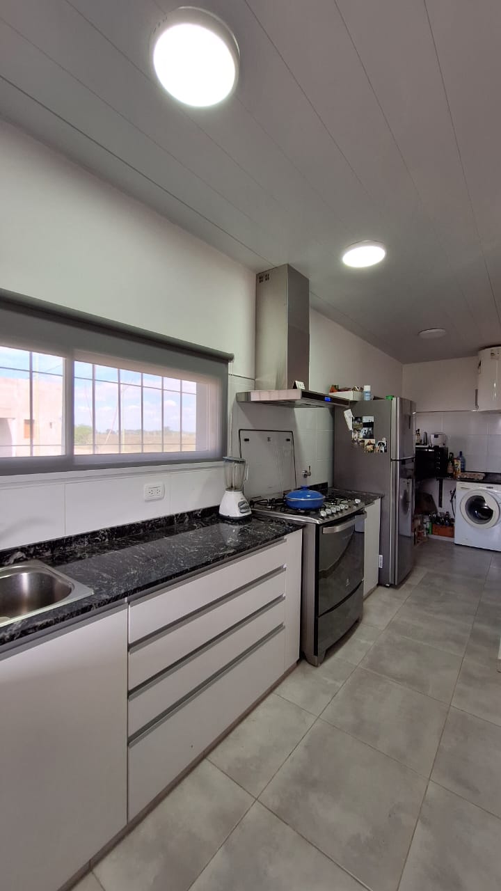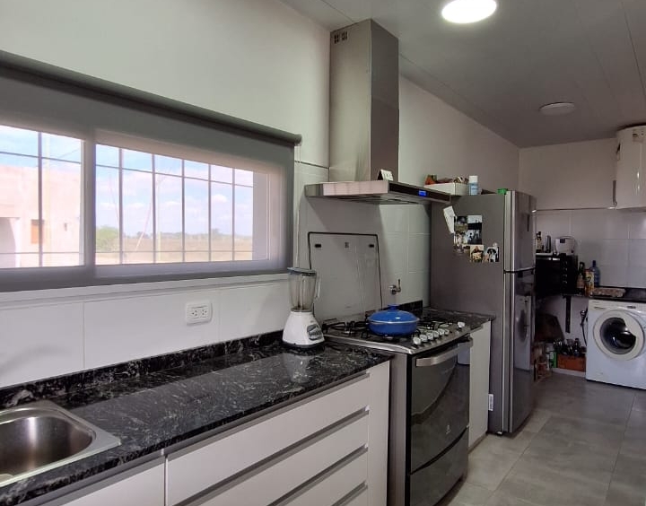 En la cocina se destaca su bajo mesada de buena calidad y su horno a medida de acero inoxidable. Posee una parte de lavadero con su bacha con bajo mesada y termo eléctrico. Además, cuenta con dos habitaciones y un baño completo. En el exterior hay una cochera semicubierta, con parrilla y bacha. La casa es calefaccionada en living por estufa a leña y el cuarto por aire acondicionado frio/calor.