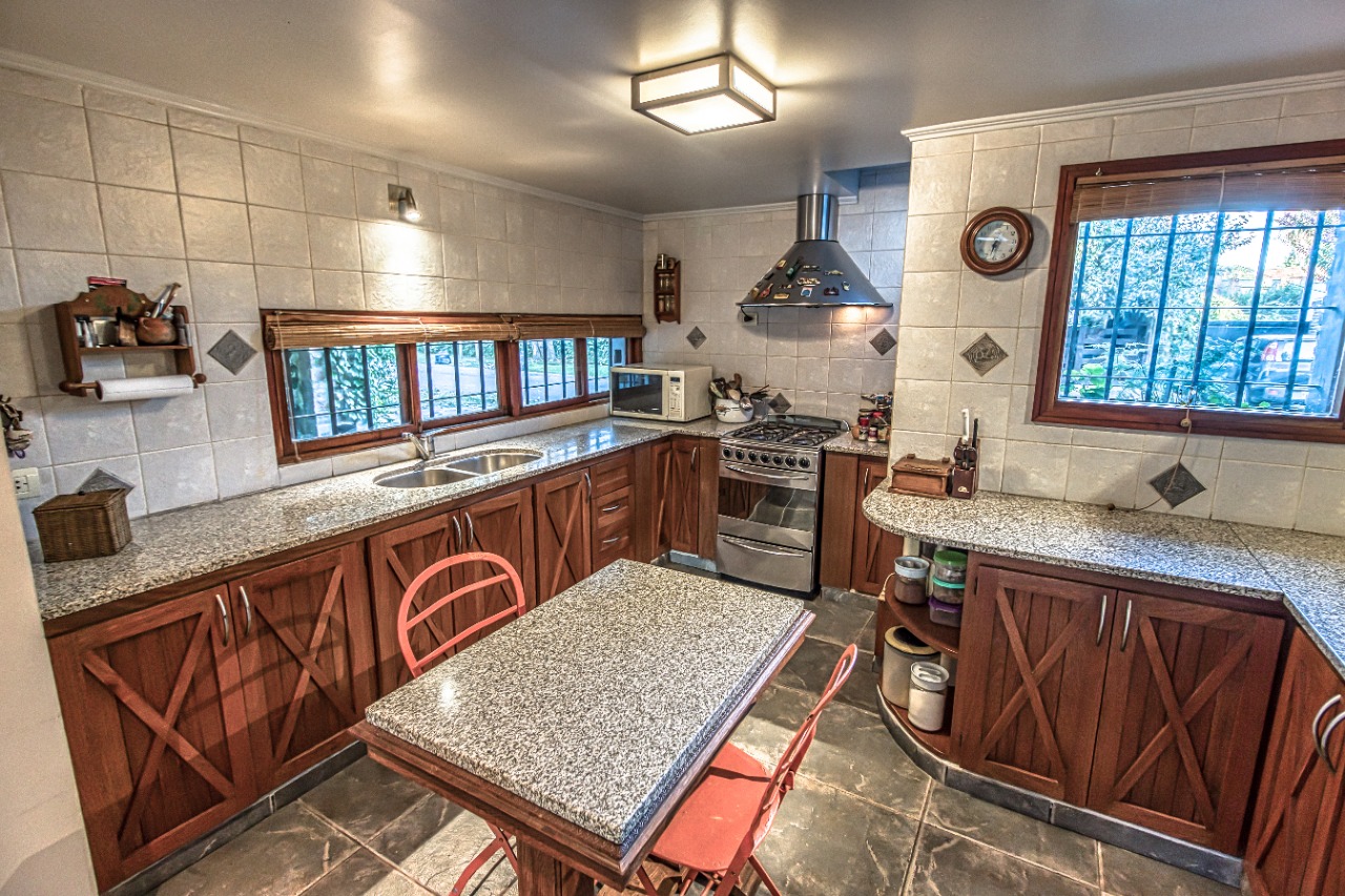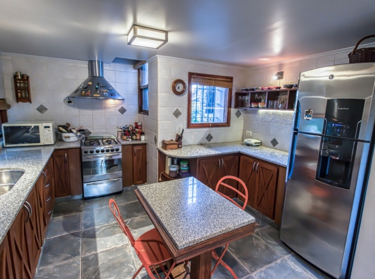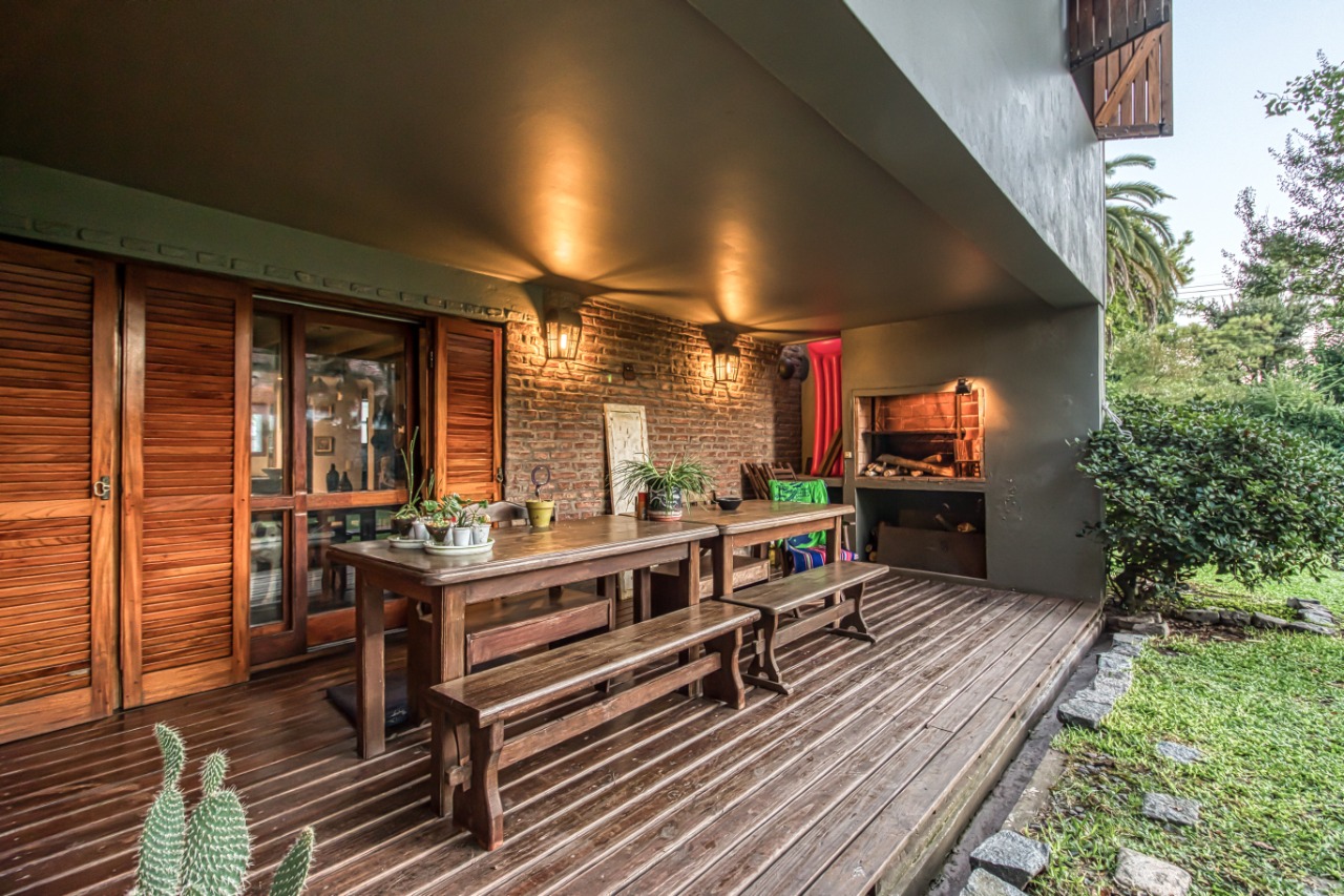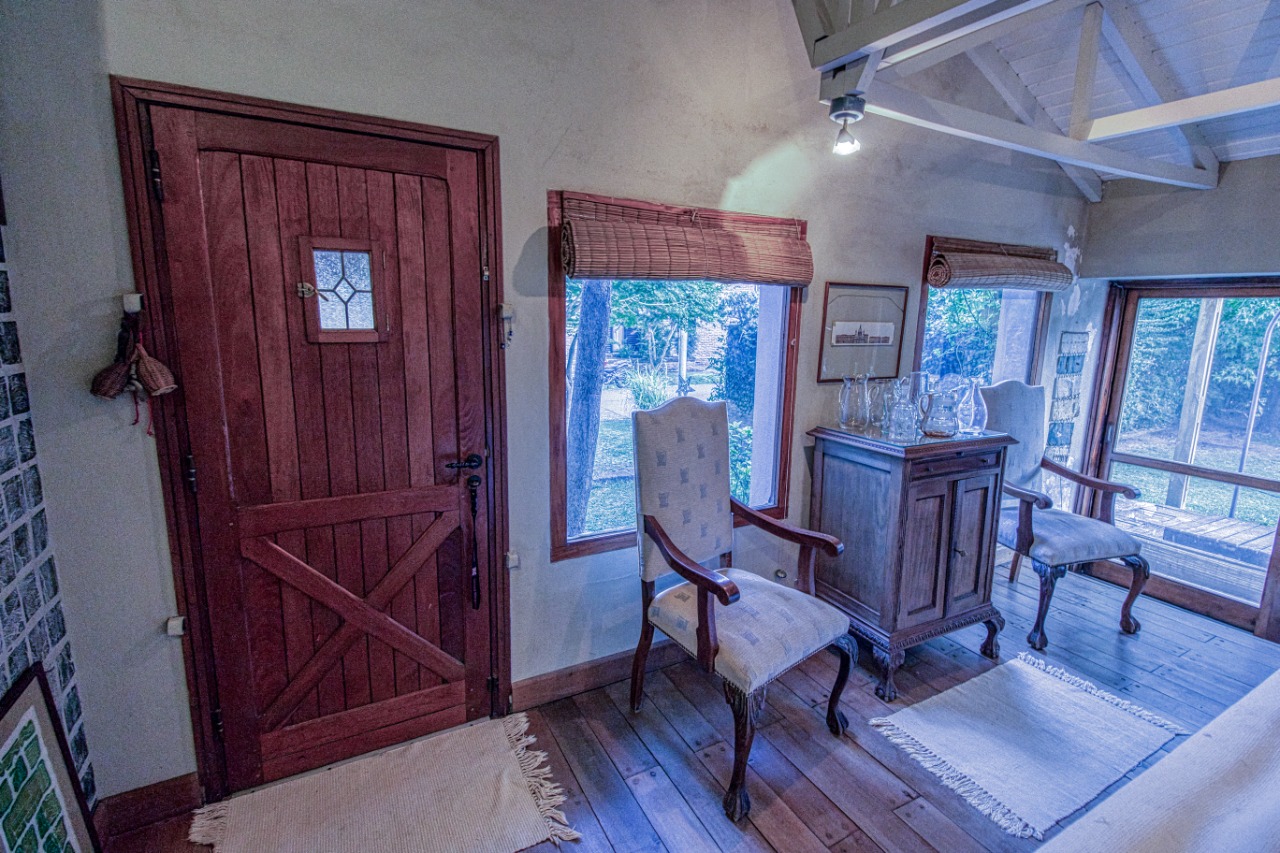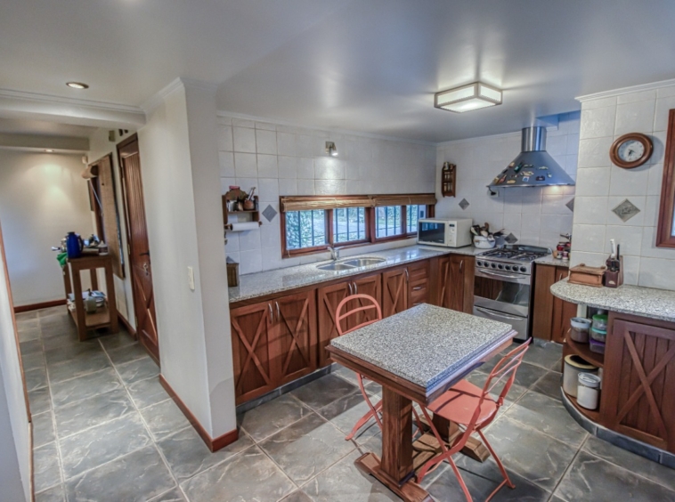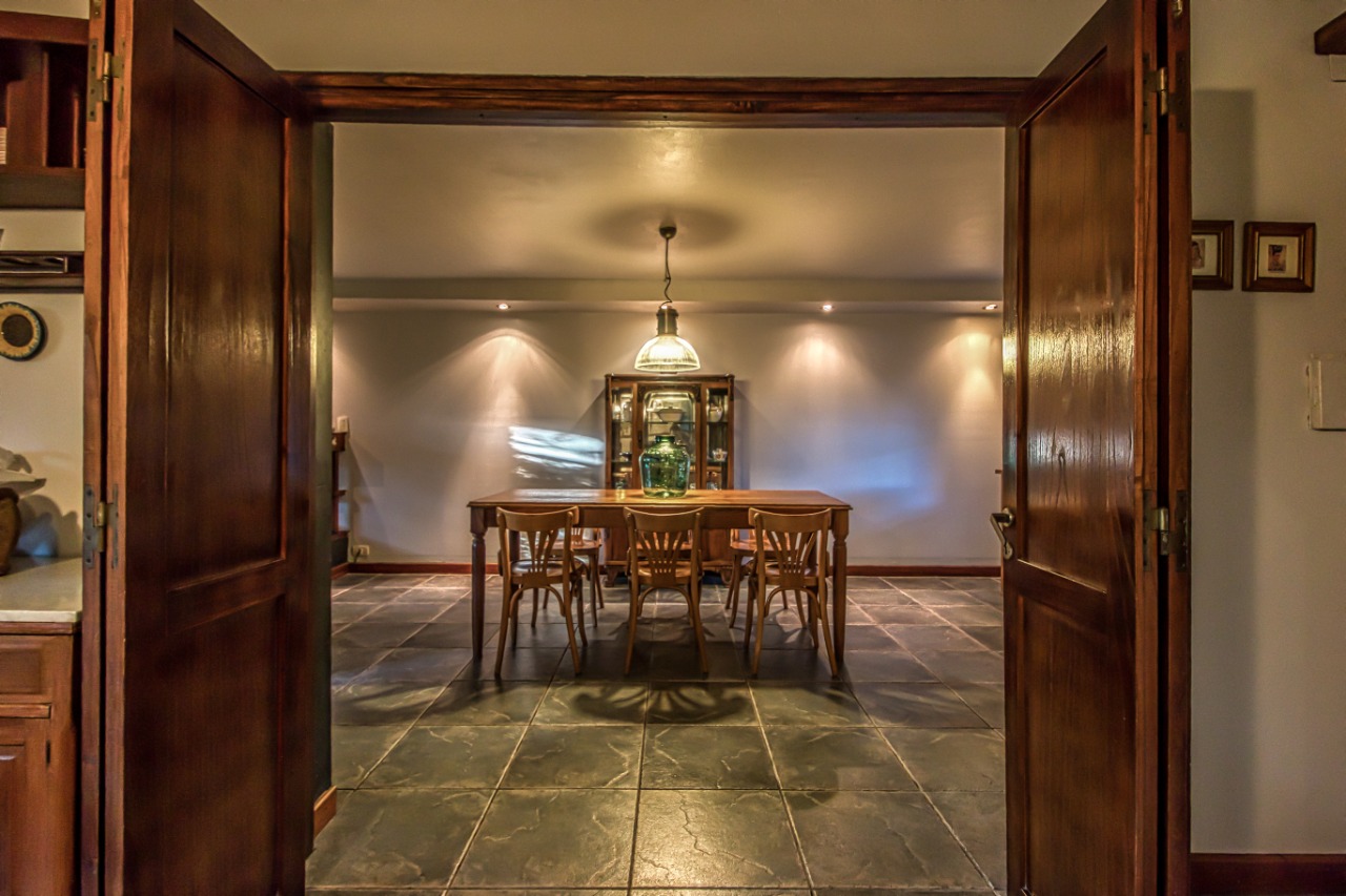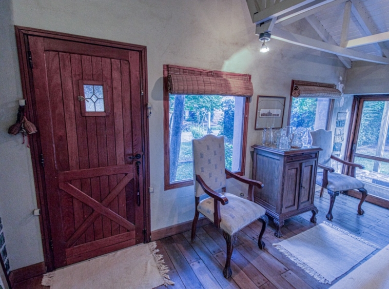 – Planta baja: ingreso hacia living principal con pisos de madera y ventanales con vista y acceso al parque, hogar a leña más detalle constructivo de cabriada en madera; a continuación en ambiente separado, comedor diario con hogar, cocina con muebles de roble bajo y sobre mesada, barra desayunadora, luz y ventilación natural, con salida al parque; espacio secundario adicional que funciona como recibidor amplio/sala de estar con vista al parque, hogar a leña, disposición de sillones.