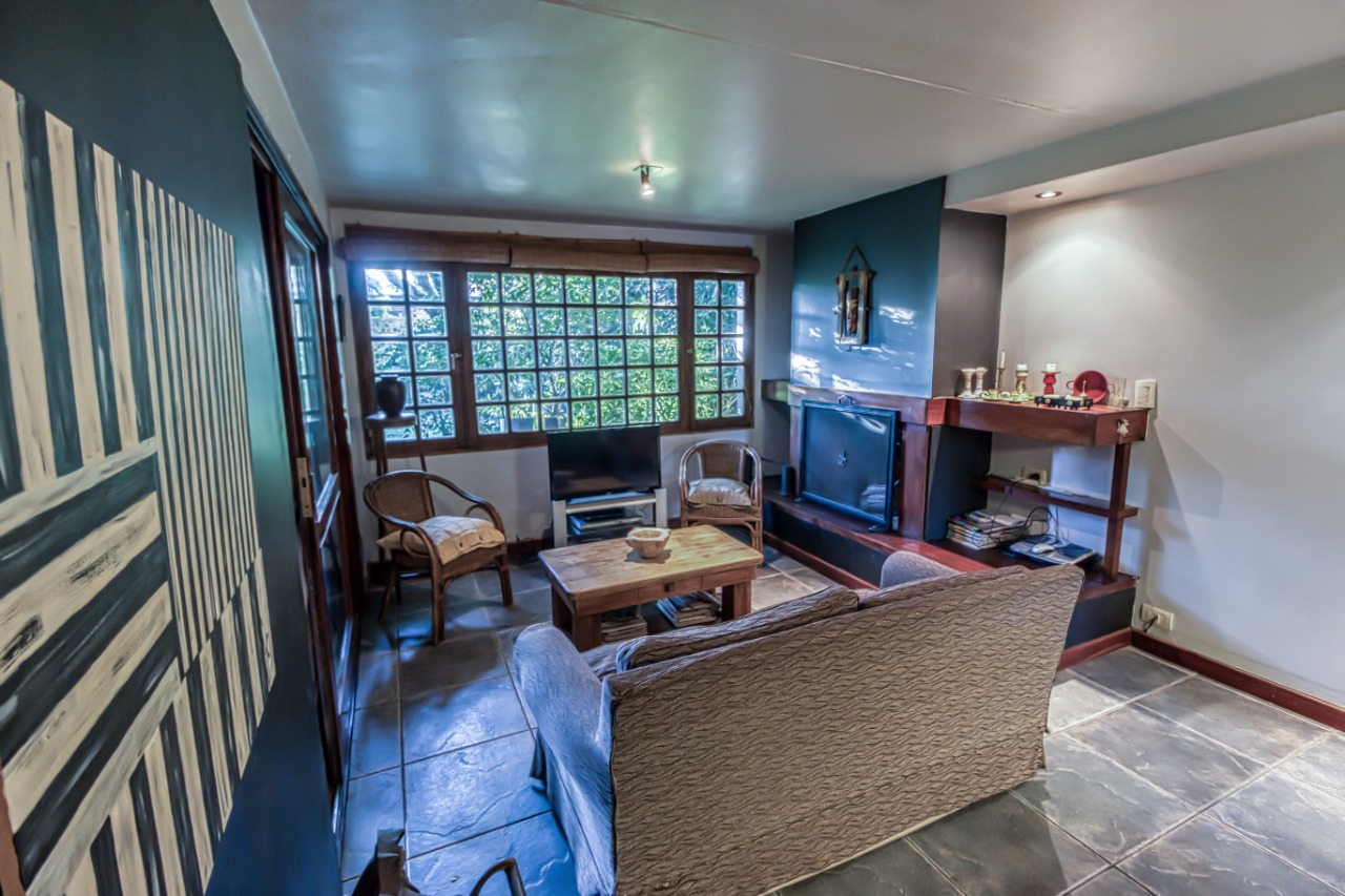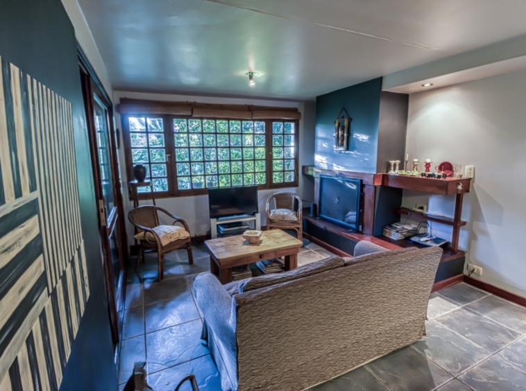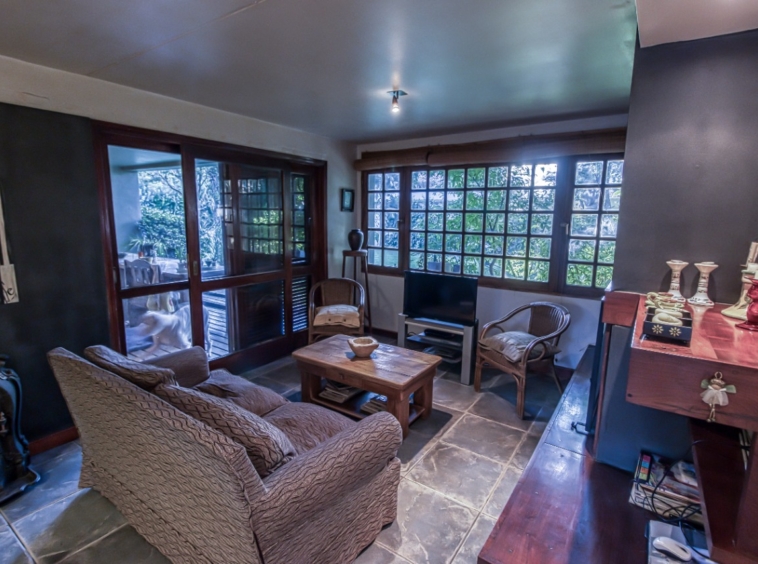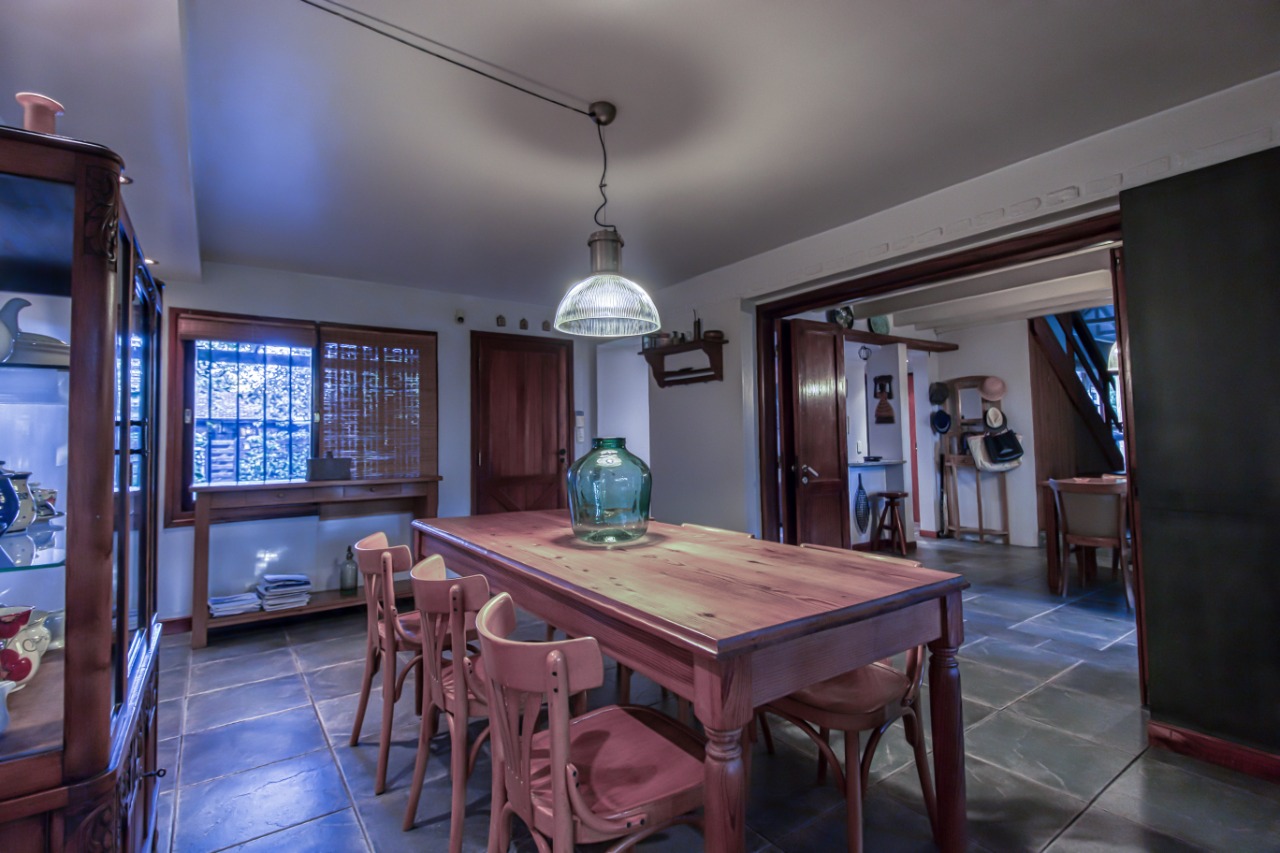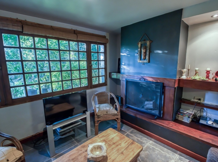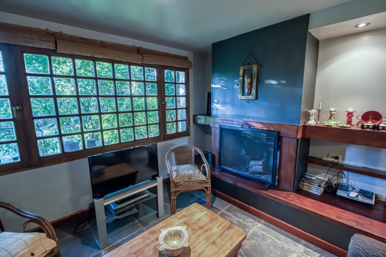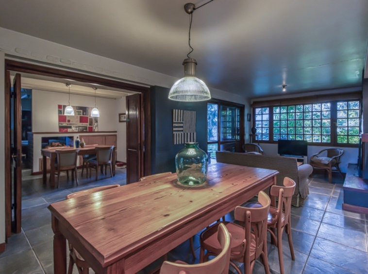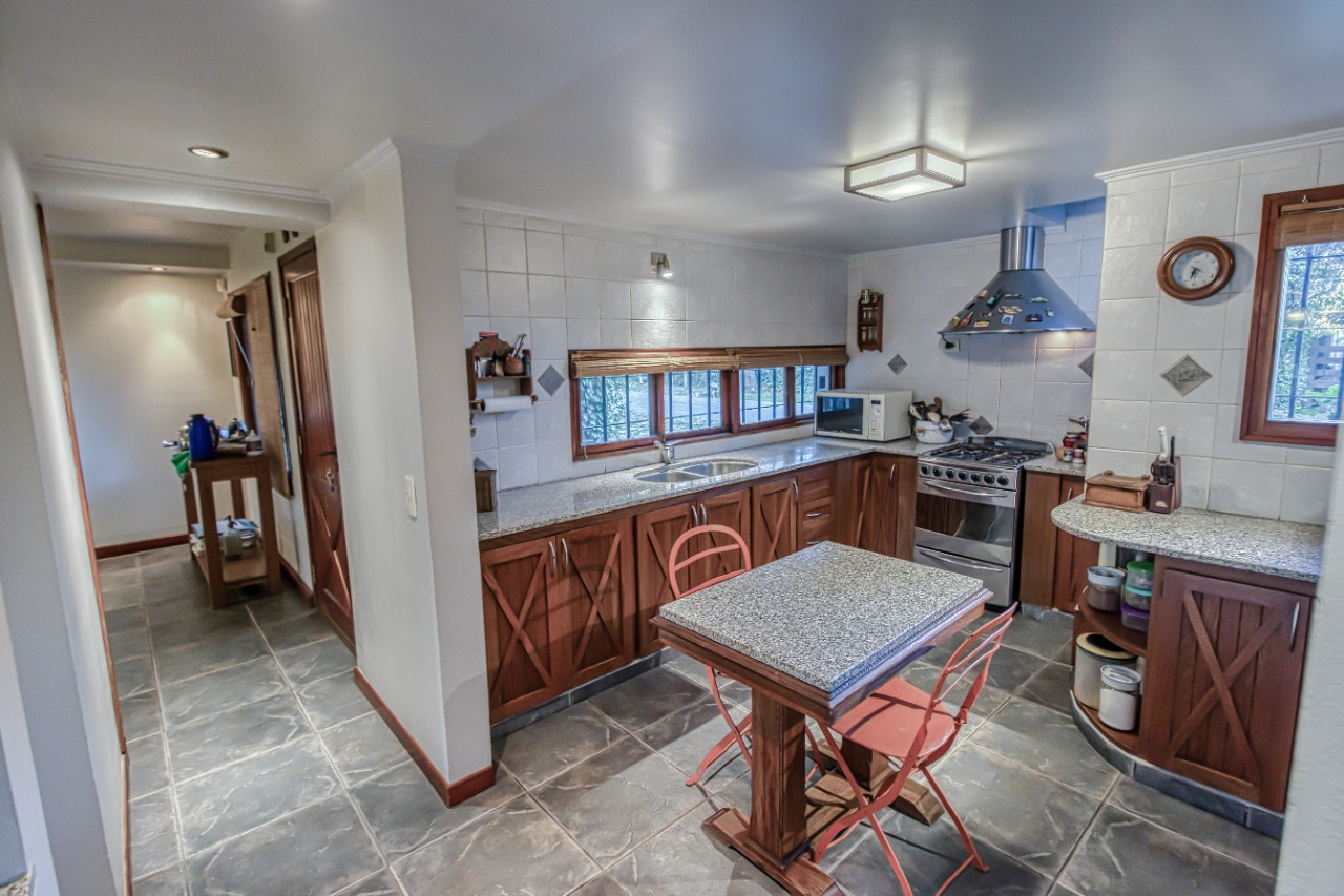 – Planta baja: ingreso hacia living principal con pisos de madera y ventanales con vista y acceso al parque, hogar a leña más detalle constructivo de cabriada en madera; a continuación en ambiente separado, comedor diario con hogar, cocina con muebles de roble bajo y sobre mesada, barra desayunadora, luz y ventilación natural, con salida al parque; espacio secundario adicional que funciona como recibidor amplio/sala de estar con vista al parque, hogar a leña, disposición de sillones.