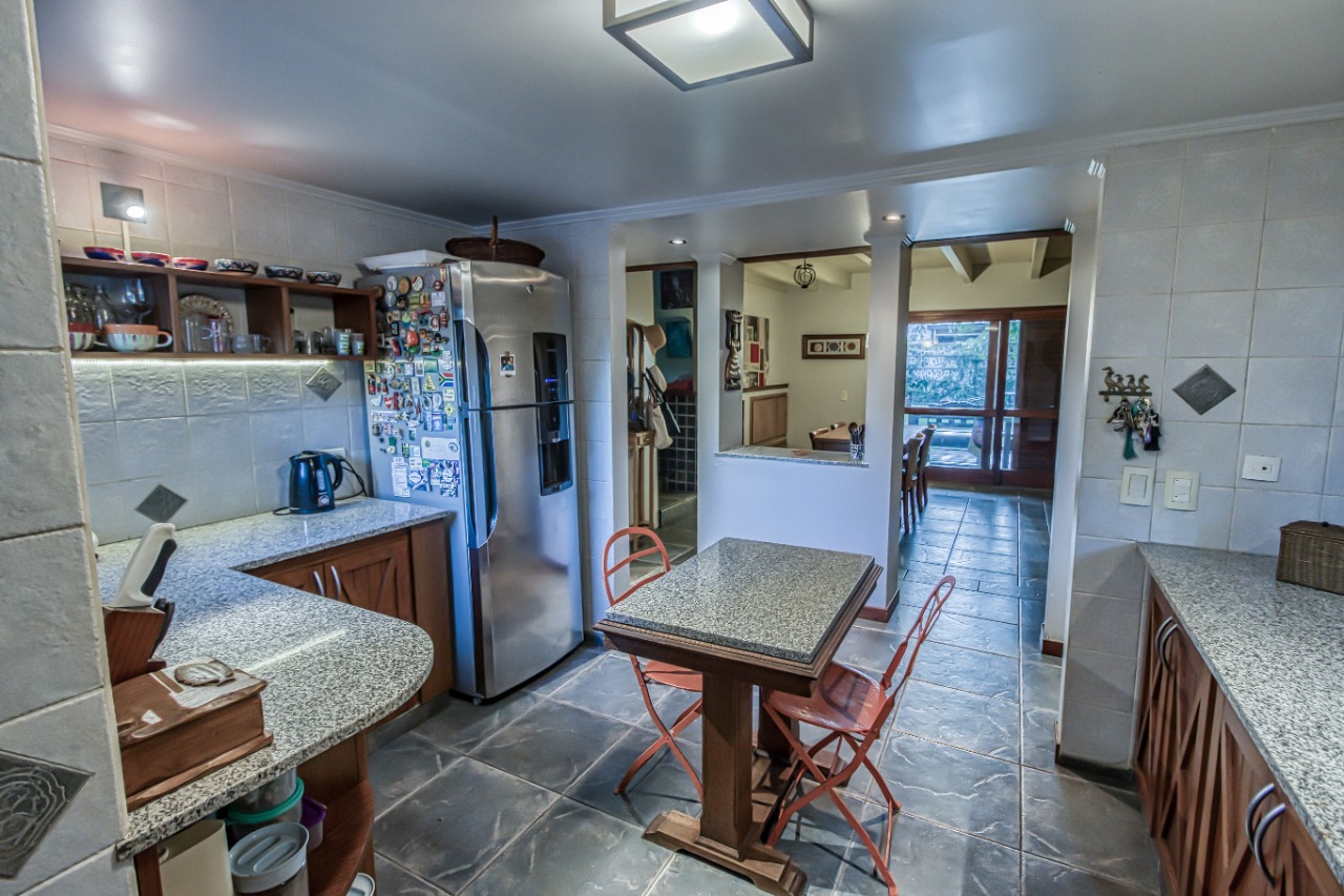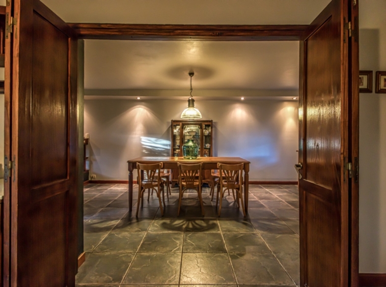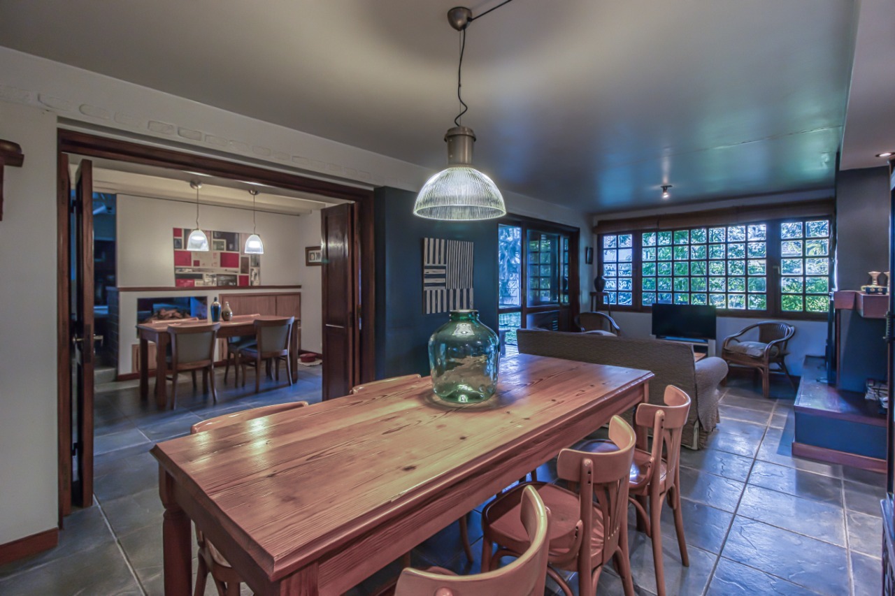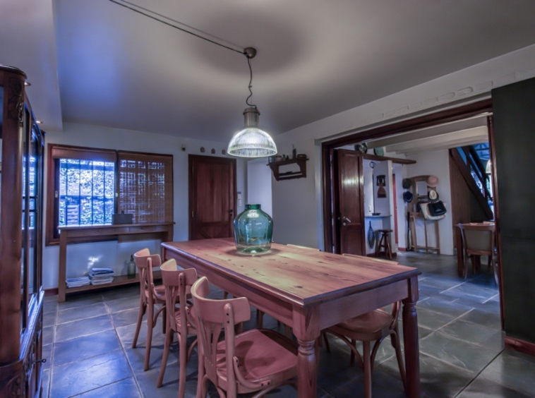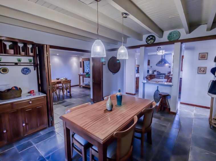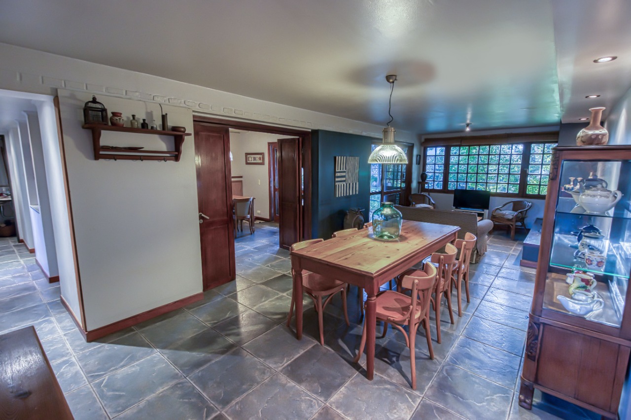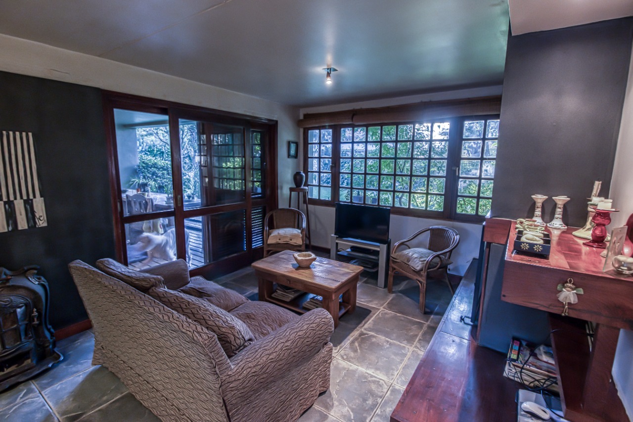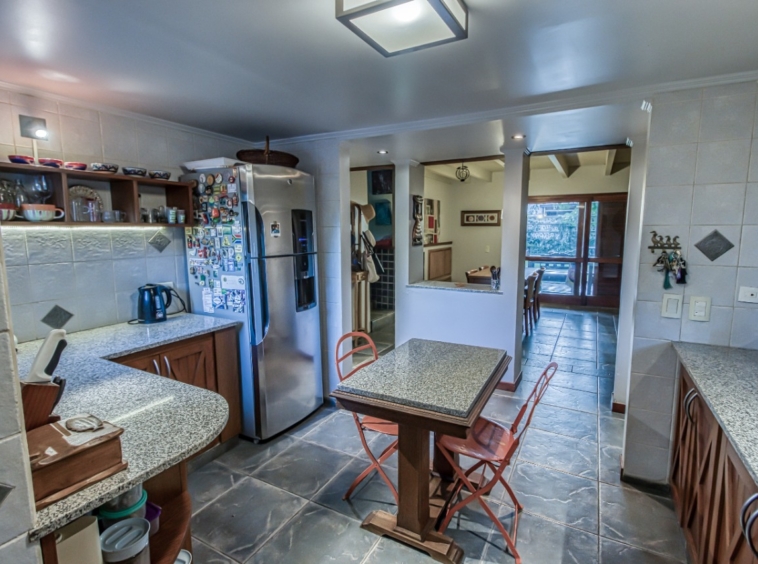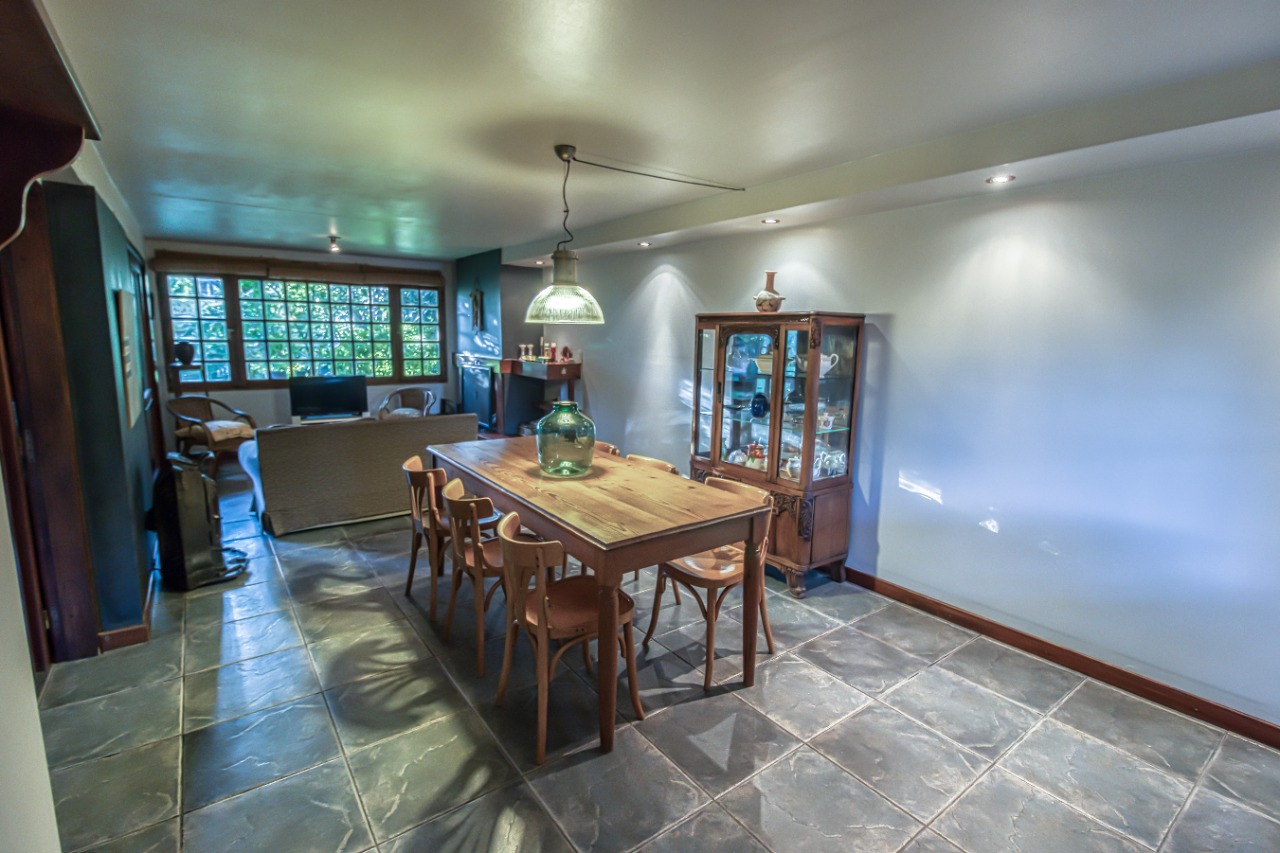 – Planta baja: ingreso hacia living principal con pisos de madera y ventanales con vista y acceso al parque, hogar a leña más detalle constructivo de cabriada en madera; a continuación en ambiente separado, comedor diario con hogar, cocina con muebles de roble bajo y sobre mesada, barra desayunadora, luz y ventilación natural, con salida al parque; espacio secundario adicional que funciona como recibidor amplio/sala de estar con vista al parque, hogar a leña, disposición de sillones.