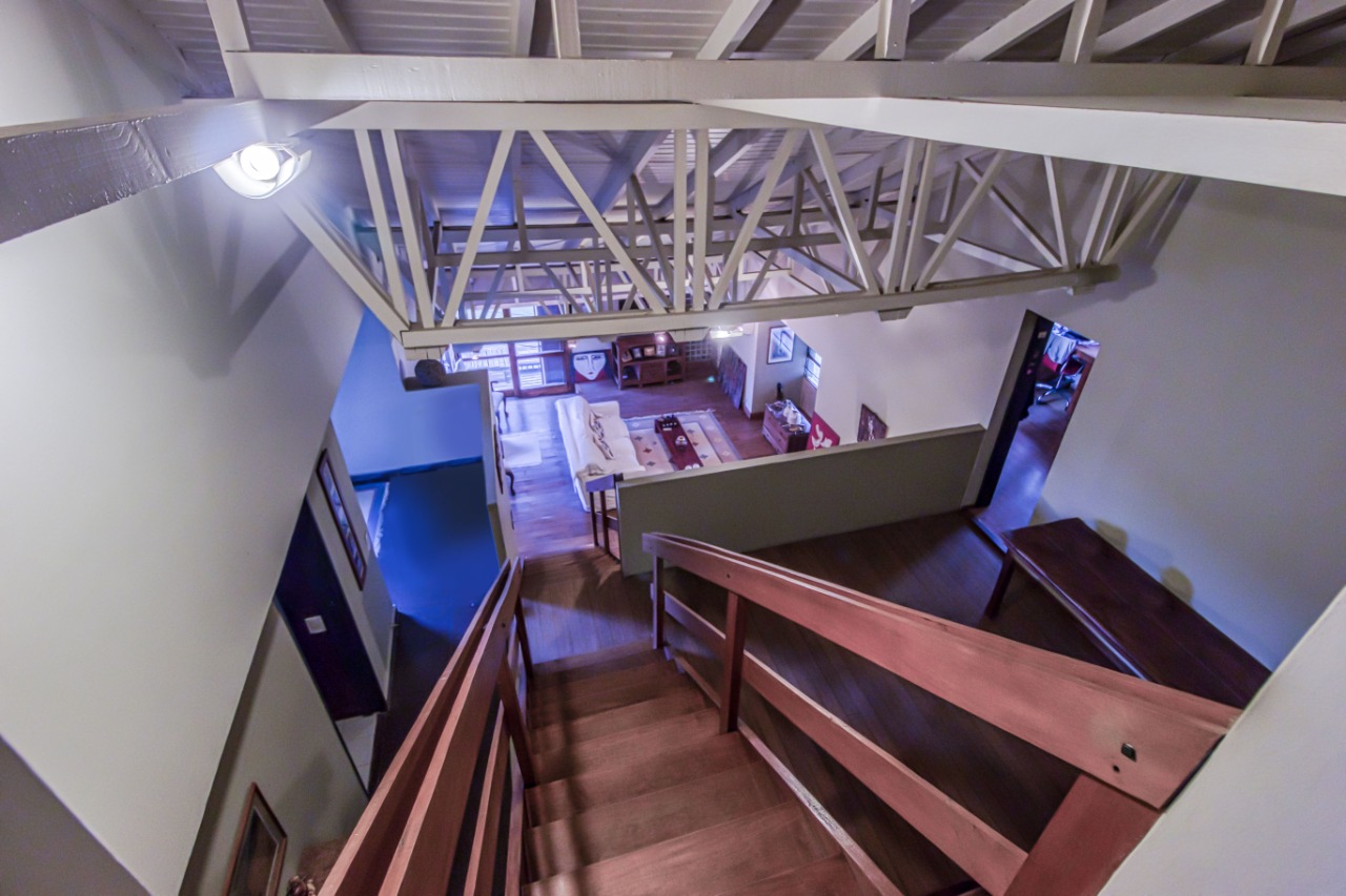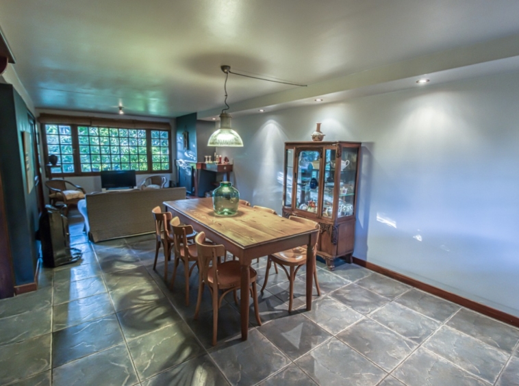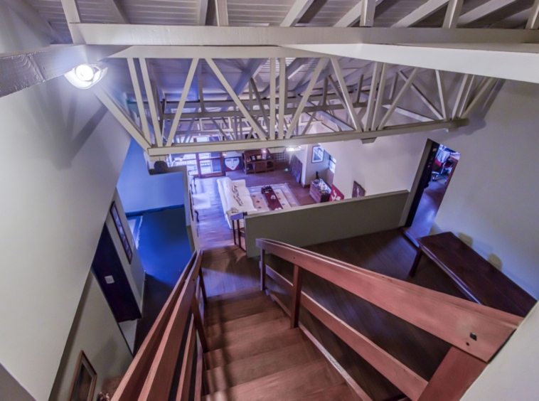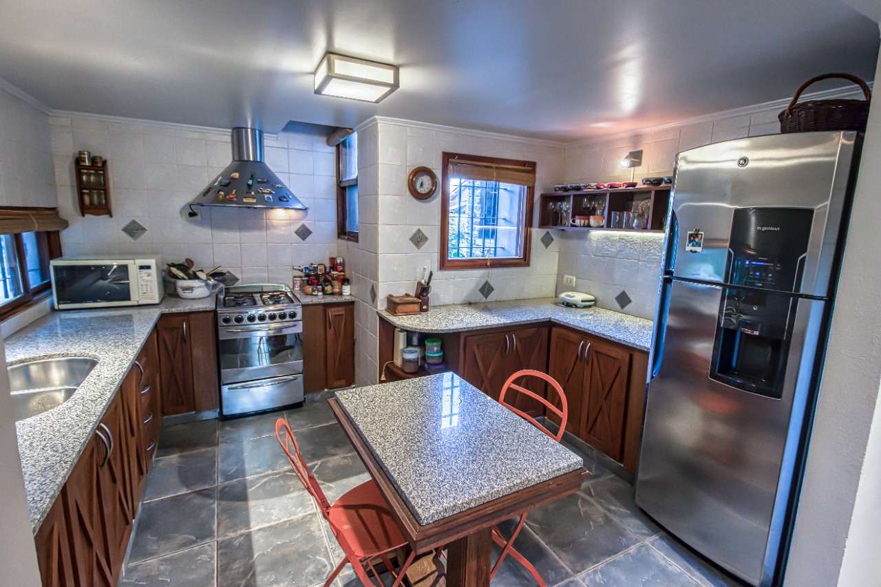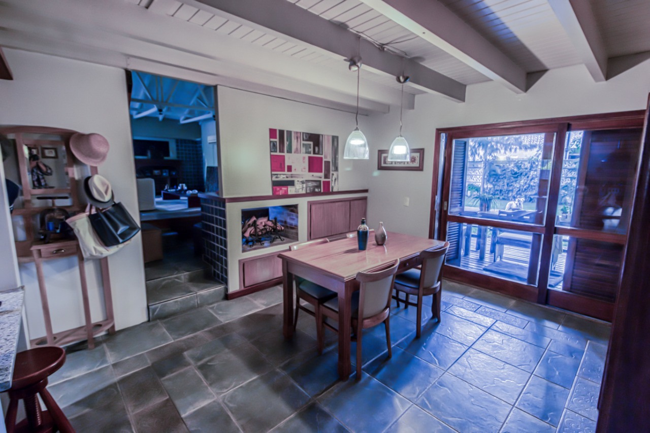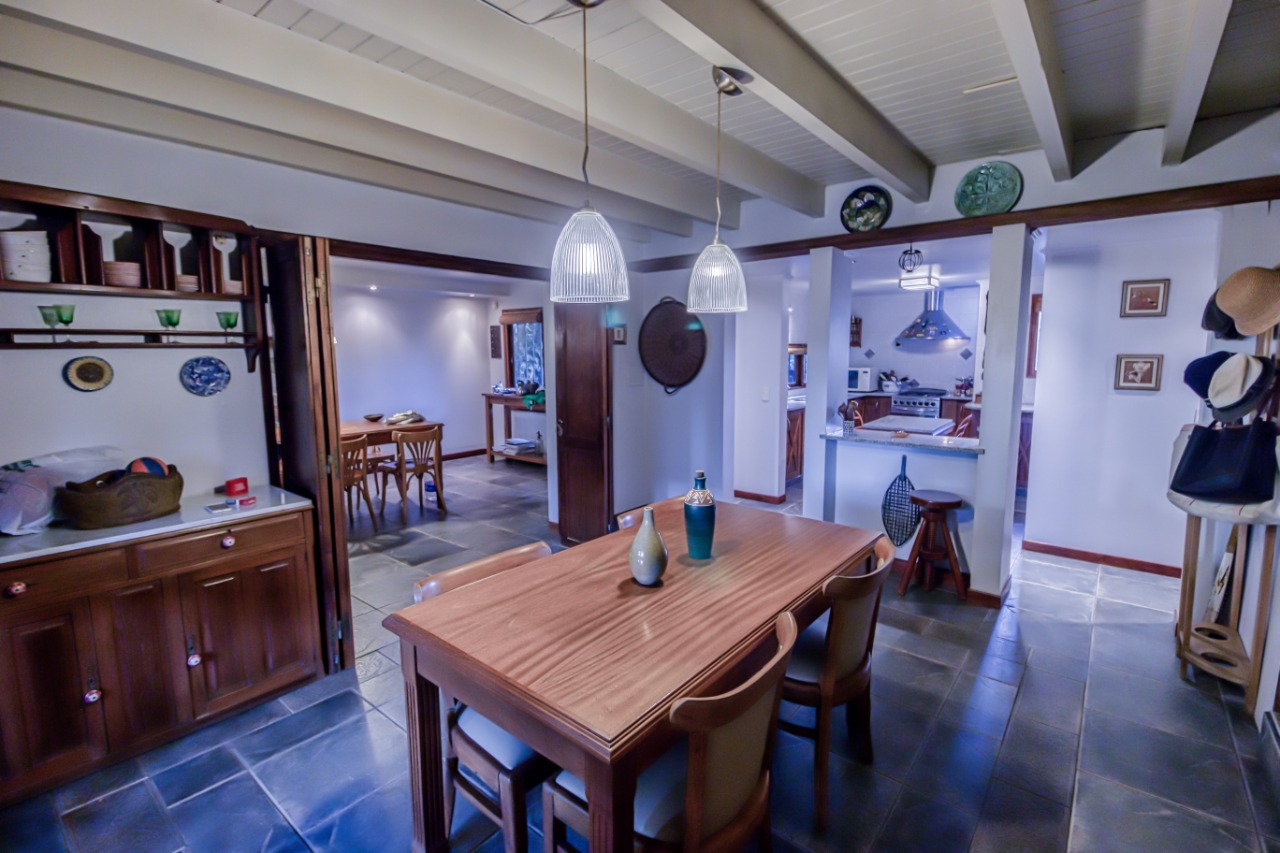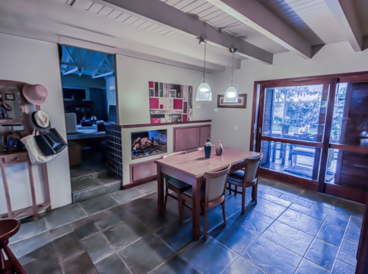 – Planta baja: ingreso hacia living principal con pisos de madera y ventanales con vista y acceso al parque, hogar a leña más detalle constructivo de cabriada en madera; a continuación en ambiente separado, comedor diario con hogar, cocina con muebles de roble bajo y sobre mesada, barra desayunadora, luz y ventilación natural, con salida al parque; espacio secundario adicional que funciona como recibidor amplio/sala de estar con vista al parque, hogar a leña, disposición de sillones.
