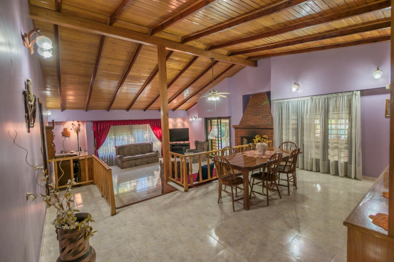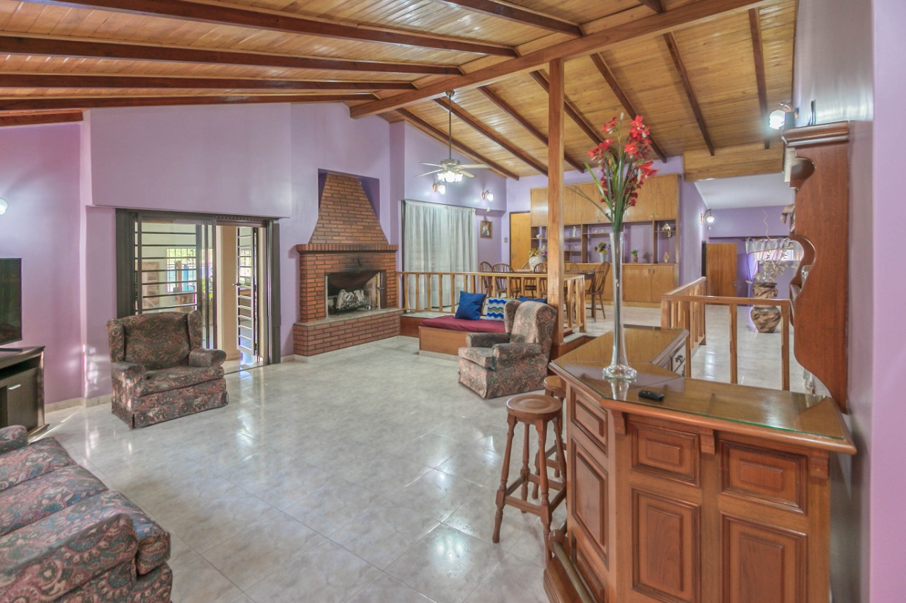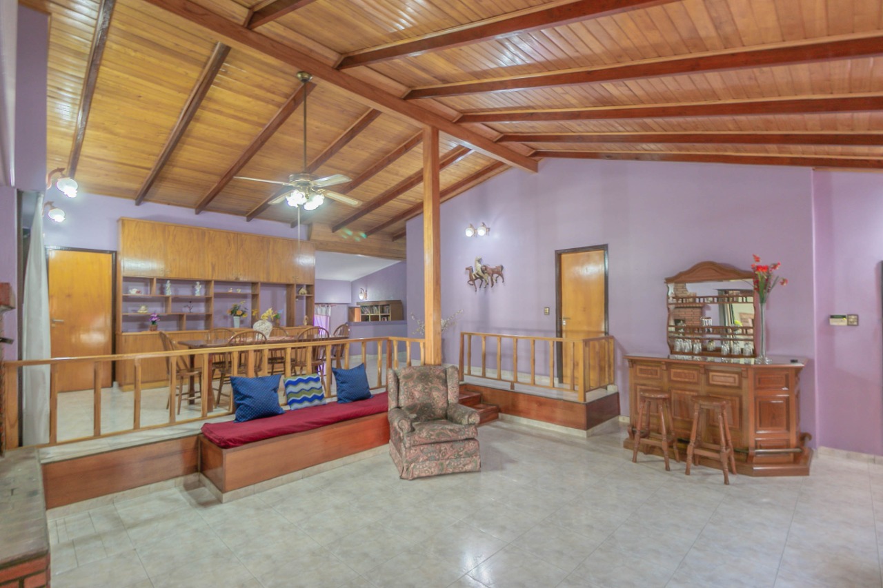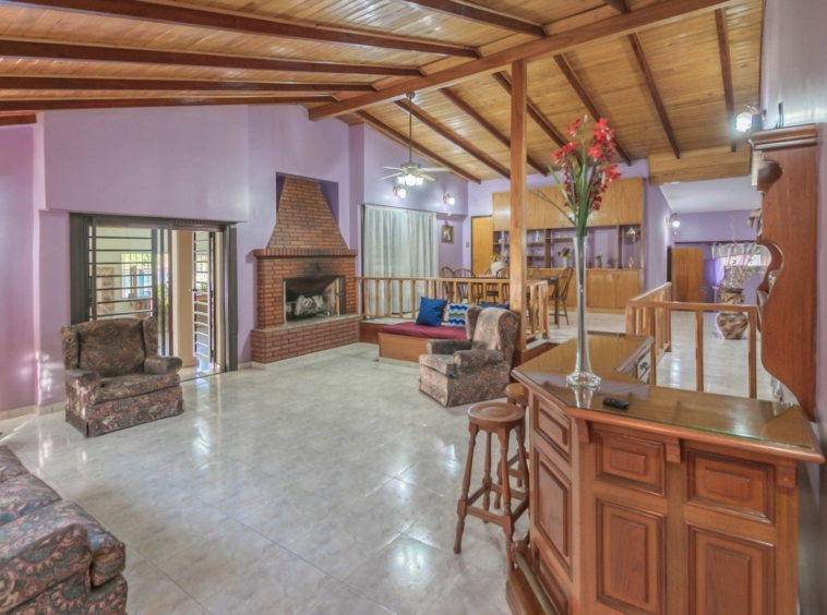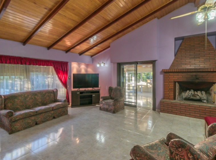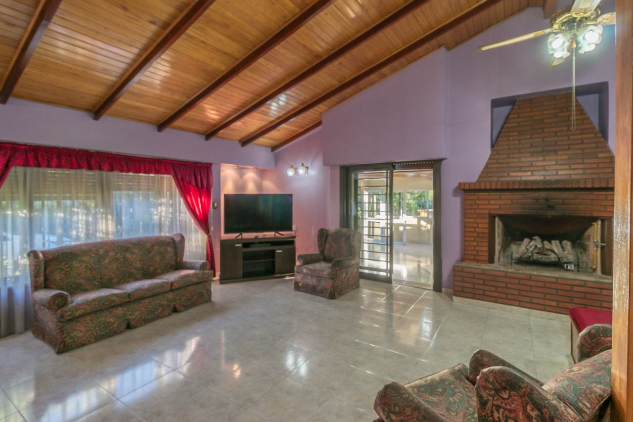 Amplio living, con hogar, ventanal, sector de bar y salida hacia el patio trasero.