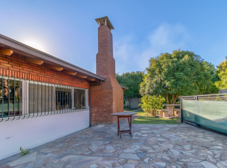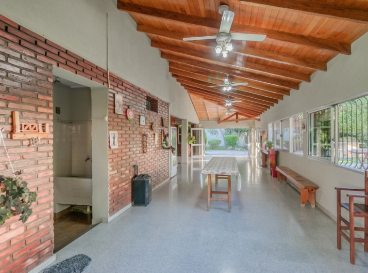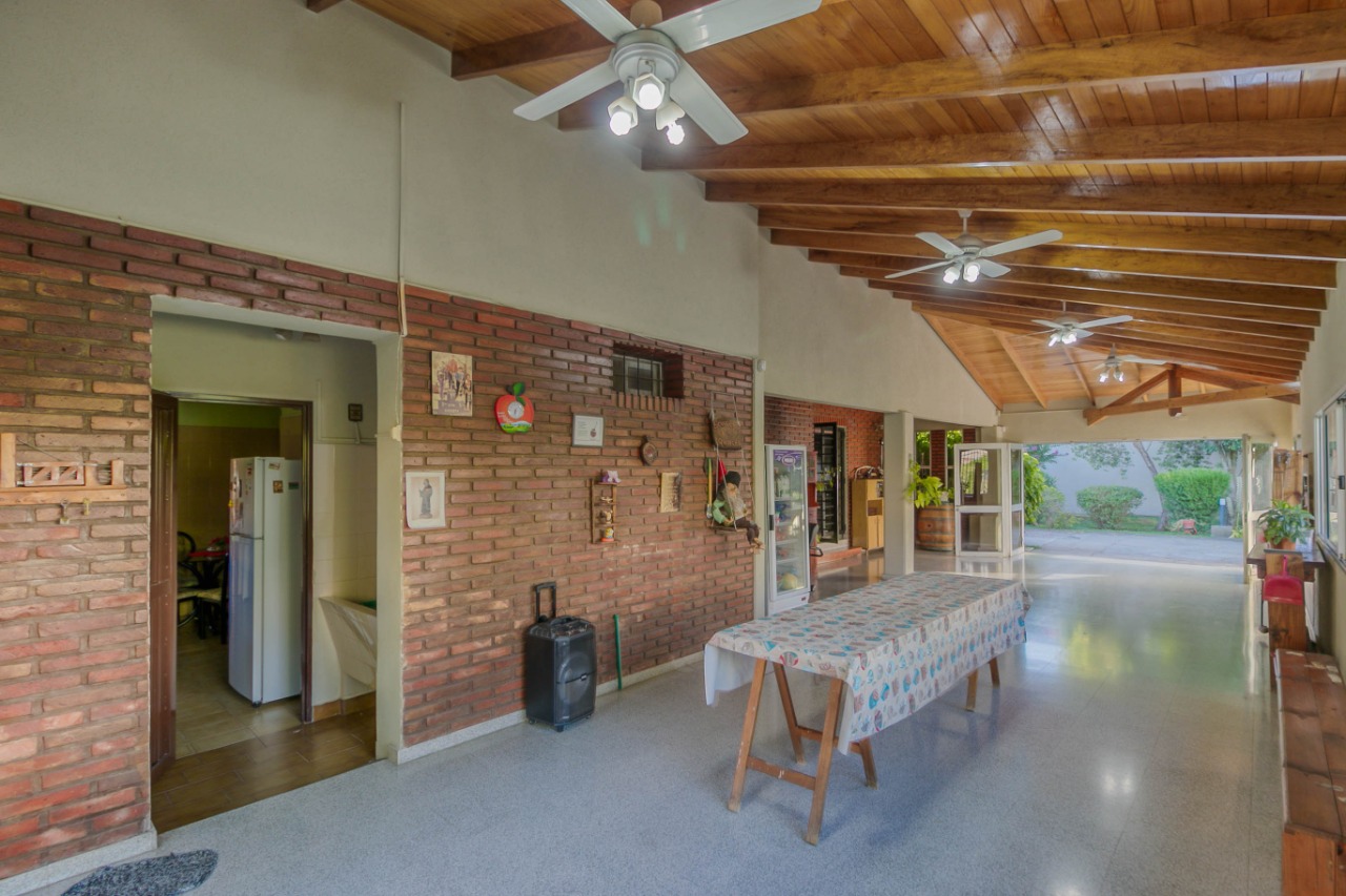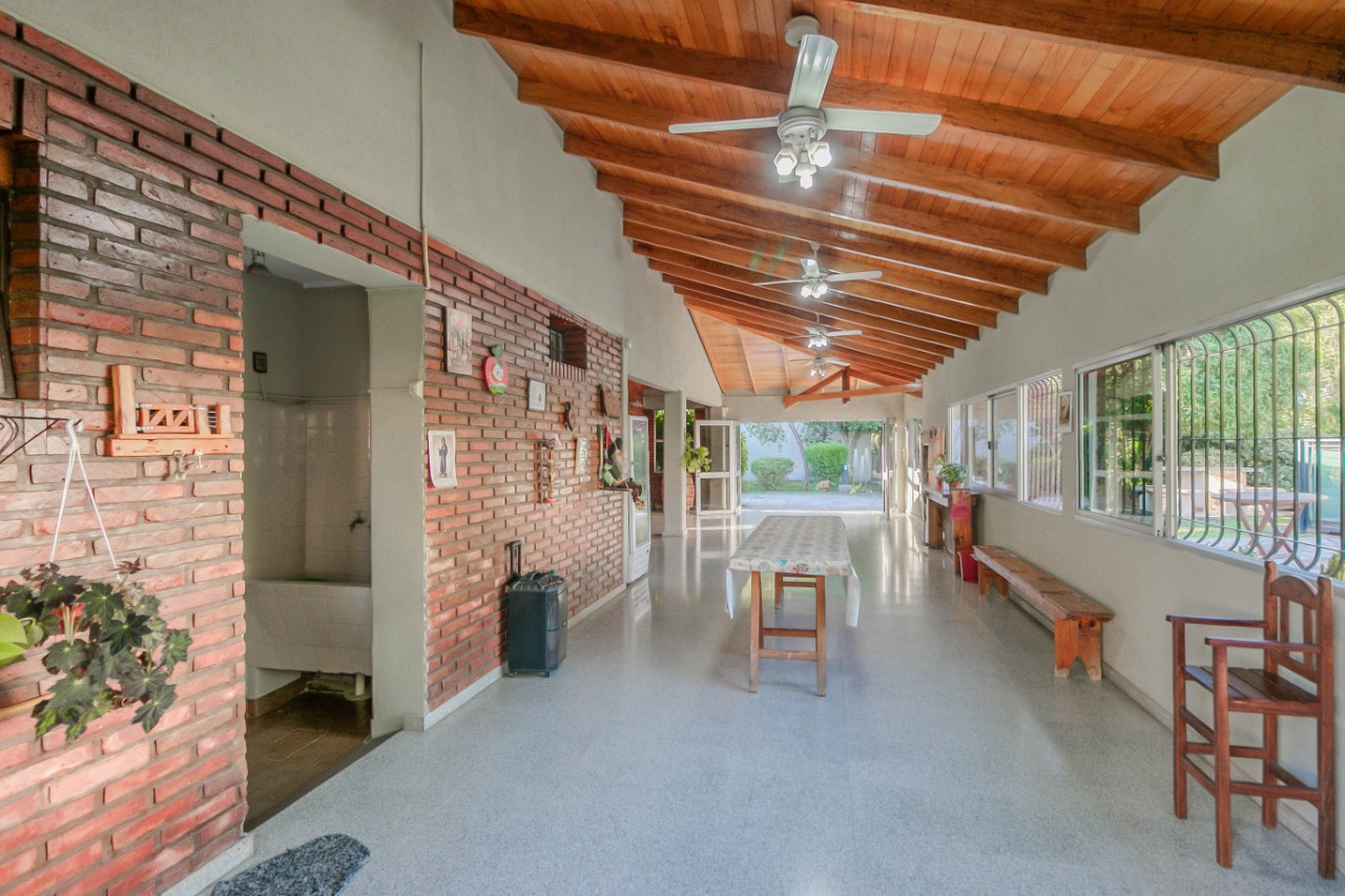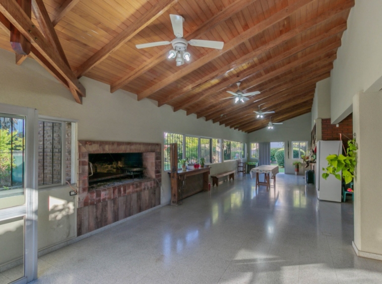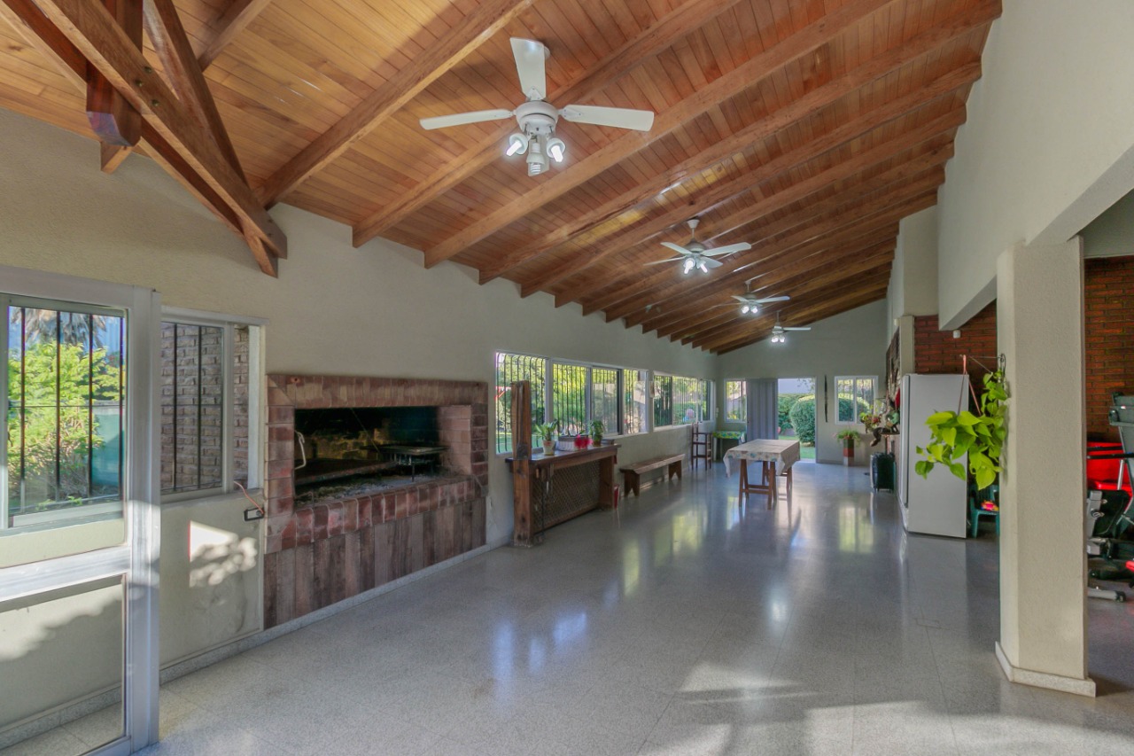 Quincho con ventilación natural, ventanal al parque, parrilla, baño y acceso directo a la casa principal.