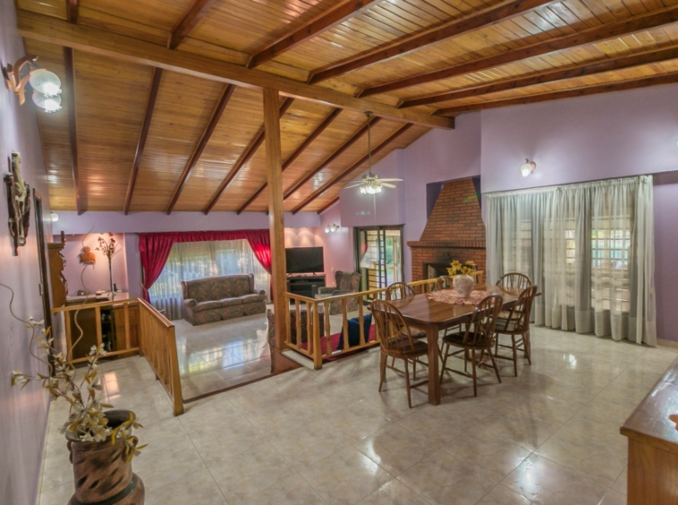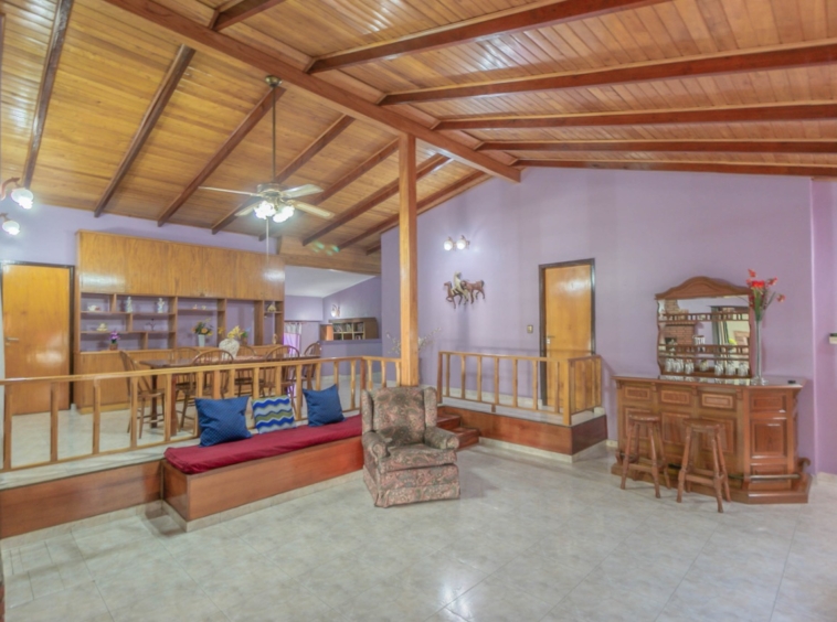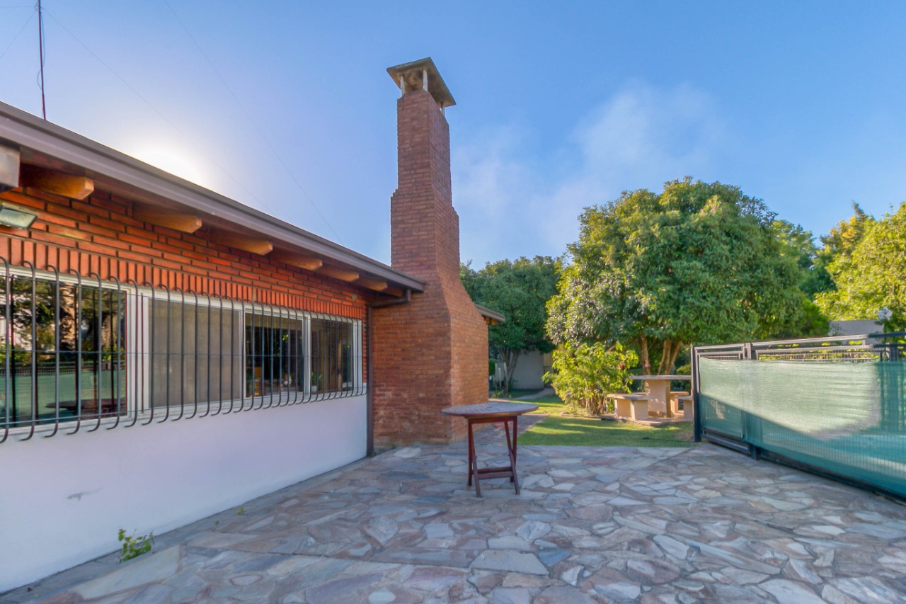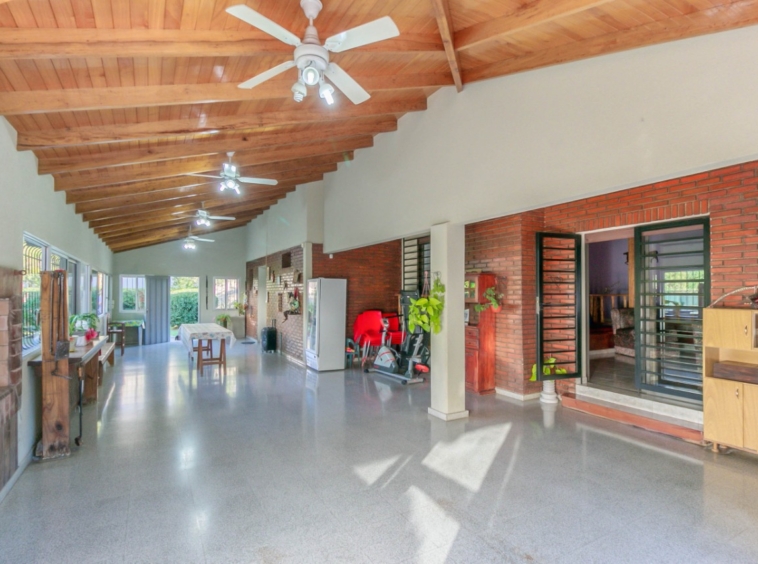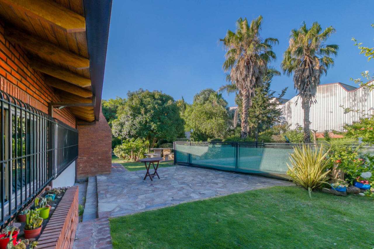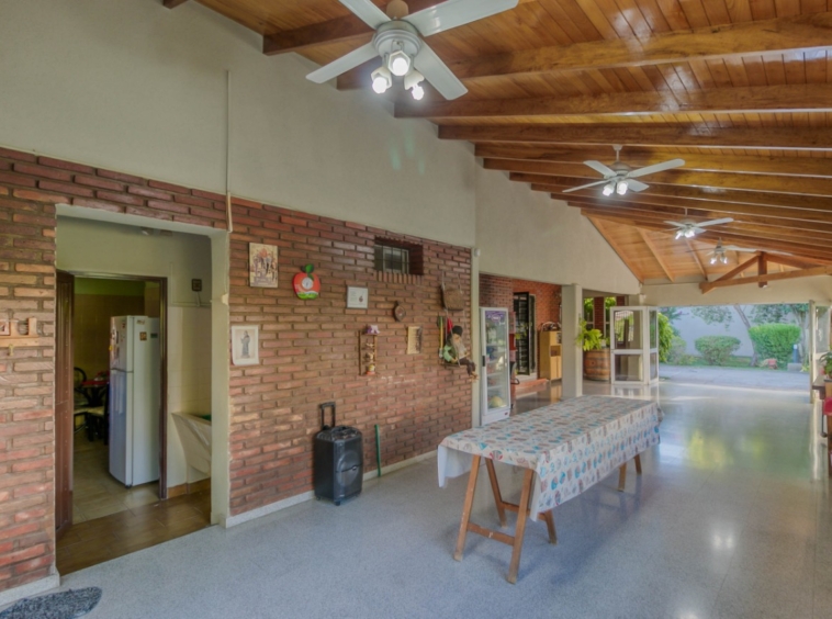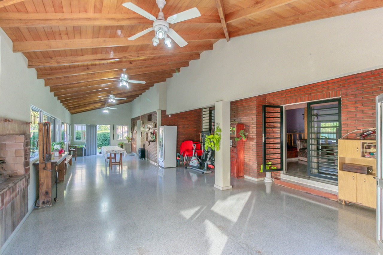 Quincho con ventilación natural, ventanal al parque, parrilla, baño y acceso directo a la casa principal.