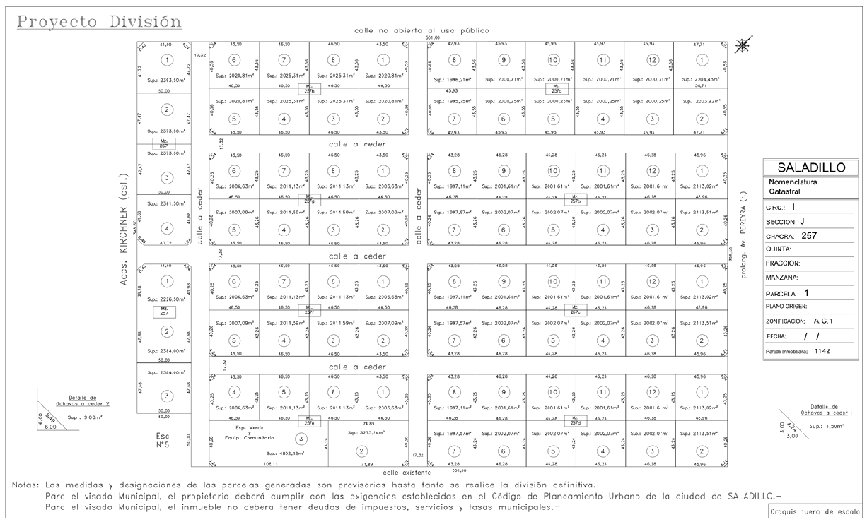El loteo cuenta con unas 8 manzanas, el cual se encuentra dividida por lotes que van desde los 1965m2 hasta los 2500m2 aprox.